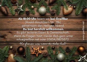 Weihnachtsfeier am 24. Dezember Wann Mi., 24.12. 18:00-21:00 Zum Kalender hinzufügen ICS herunterladen Google Kalender iCalendar Office 365 Outlook Live Wo GreifBar Wohnung Roald-Amundsen-Str. 15, Greifswald Veranstaltungstyp synchronisierte Termine
